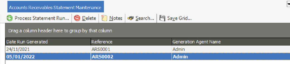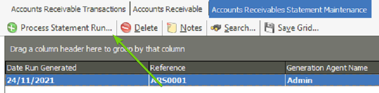 - On the Maintenance screen, you can view the already created Statement Runs, or you can create a new one. In this case we are going to create a new one. Click on "Process Statement Run" to open up the dialog screen.