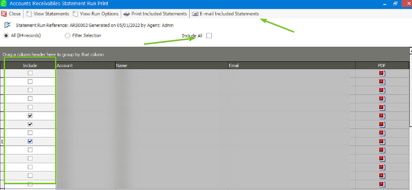- This will give you a list of all the Accounts Receivable, the emailadress of the Client, and a PDF preview button. To email all the created Statements, click "Include" for specific statement (or "Include All") and hit "E-Mail Included Statements"