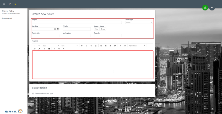 The following screen will then be displayed where the client then needs to fill in the subject of the ticket, the due date, set the priority level, select a ticket type using the drop-down menu and lastly fill in a message describing the reason for the ticket.
