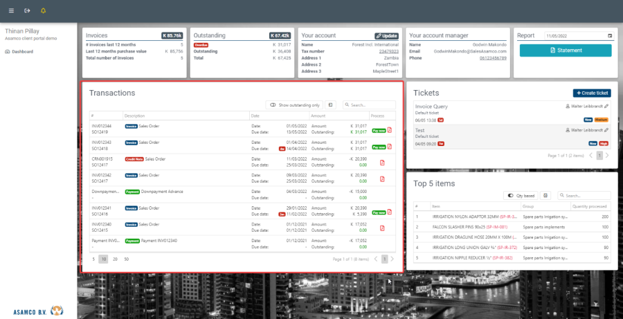 The transactions screen will display all the clients past and up to date transactions including all invoices, credit notes and payments that have been made.