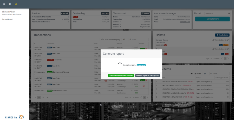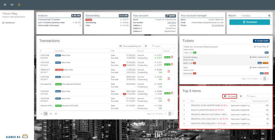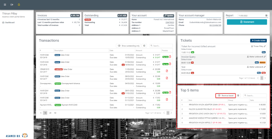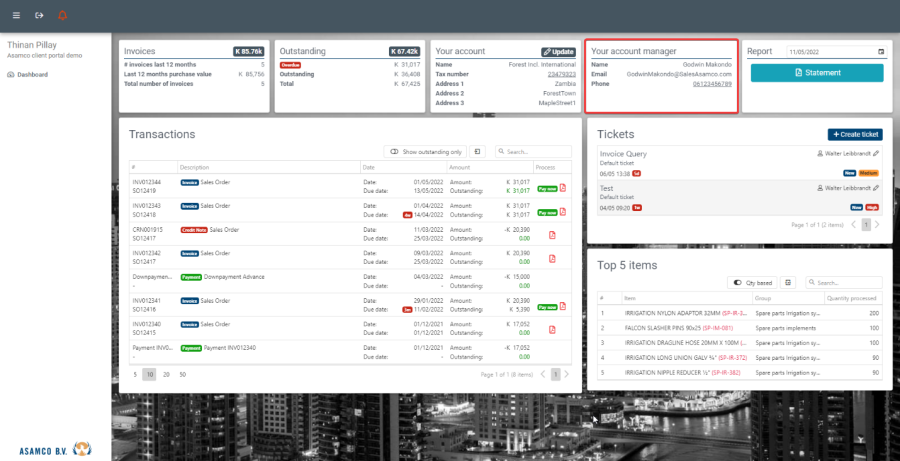 The "Your account" block provides all the clients personal information including the address and tax number. These fields can only be updated by the supplier.