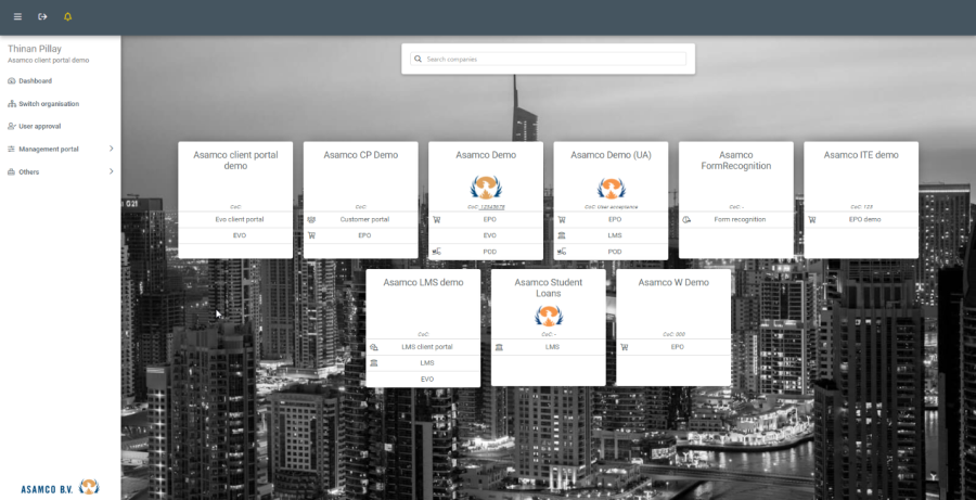After clicking on the Asamco client portal company, you will be presented with an overview of all the connected applications linked to that company. The connected applications you can see here are managed by permissions that are assigned by the organisation's administrator.