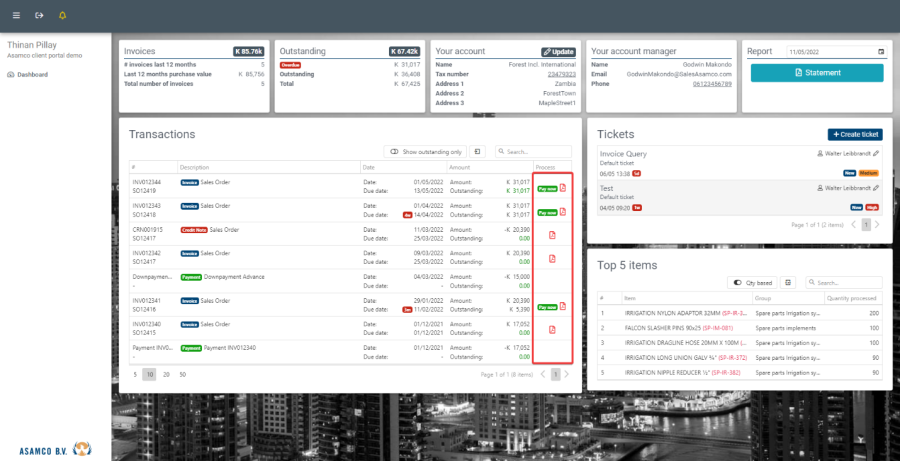 The pay now option allows clients to pay currently outstanding invoices by clicking on the green pay now button. As well as a download button for downloading statements.