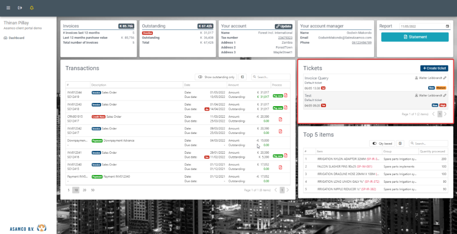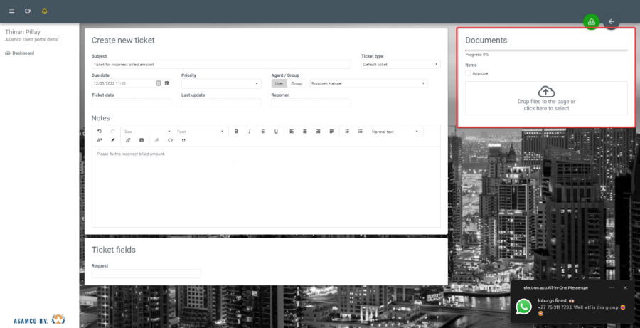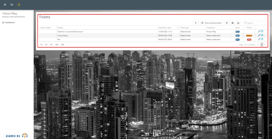 The tickets allow the user to log any queries or issues regarding the payment of invoices or incorrect billed amounts. The mini pop-up screen also shows an overview of all current pending and resolved tickets with their priority levels.