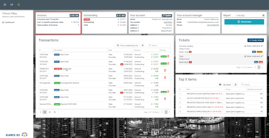 On the top of the screen you will find the invoices including the total purchase amount and total number of invoices in the last 12 months.