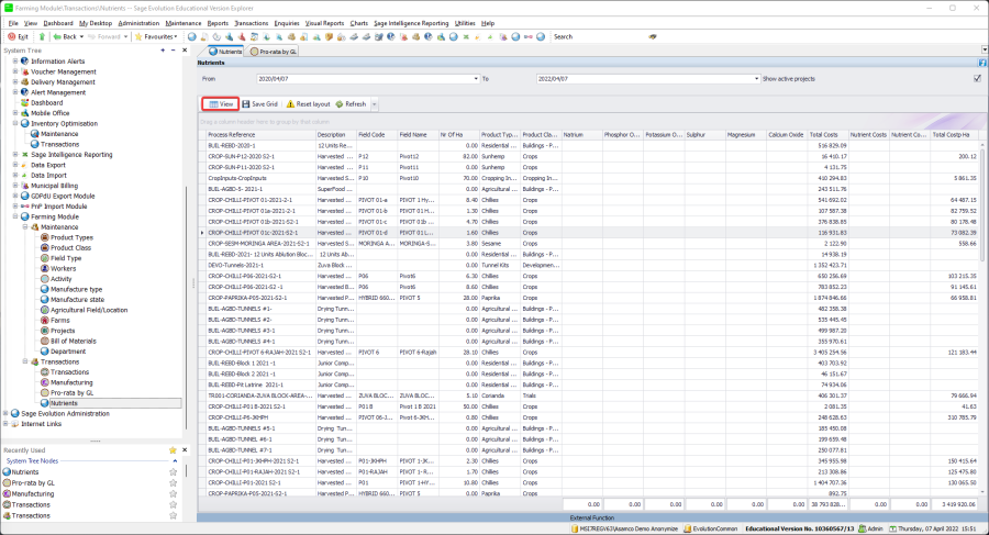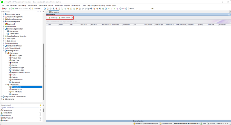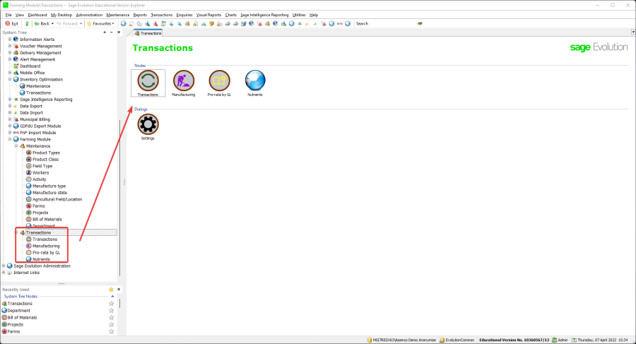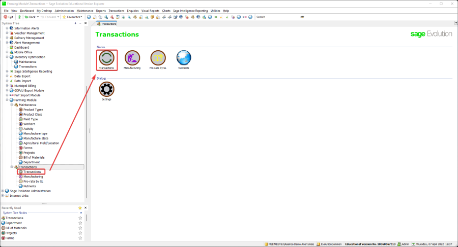 Under the transaction tab you will find various nodes in which you can transact with your farming module, click on the transactions node either using the left tree menu or the overview screen as shown below.