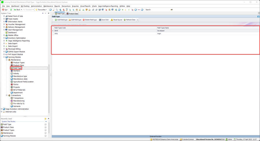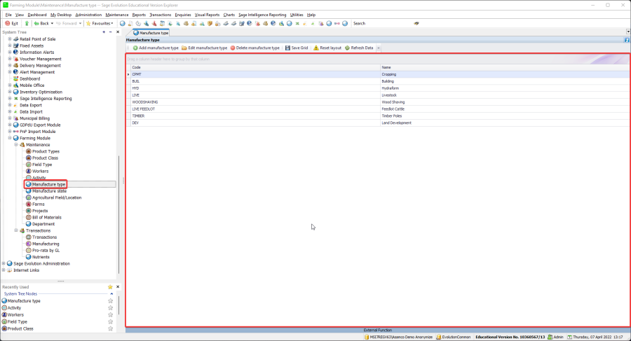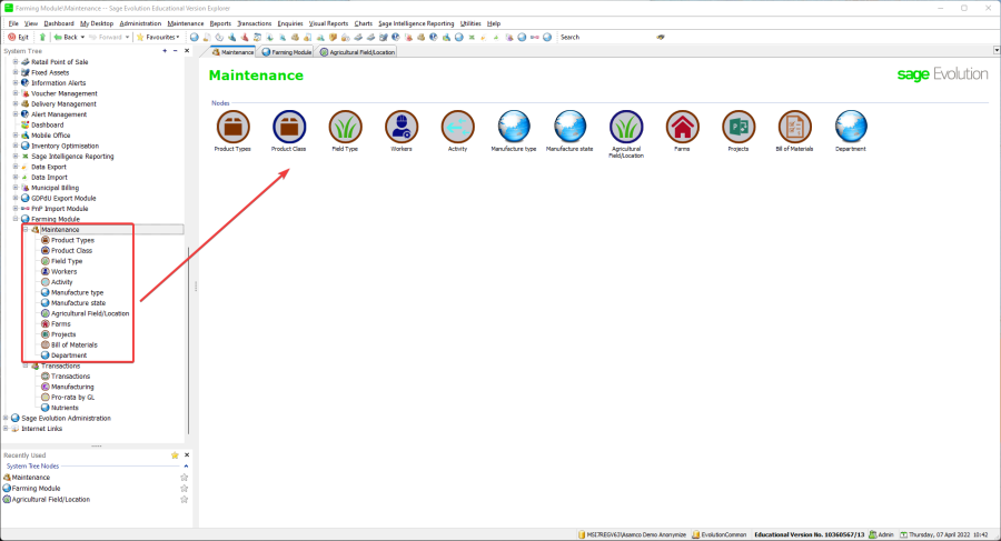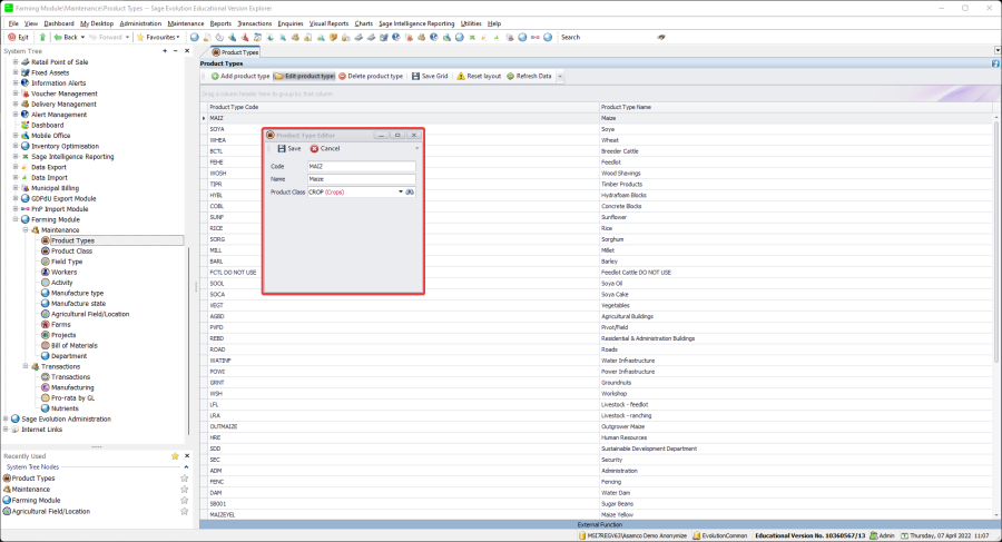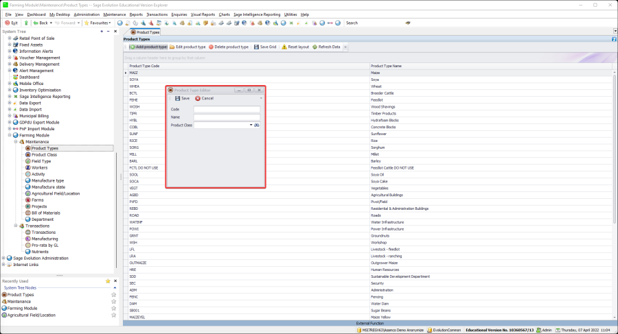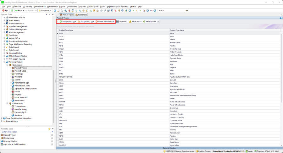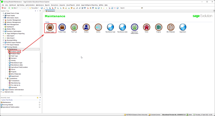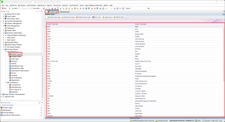 Under the maintenance tab you will find various nodes in which you can maintain your farming module, click on the product types node either using the left tree menu or the overview screen as shown below.