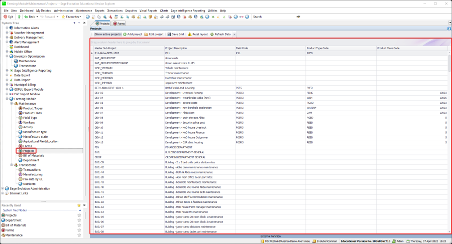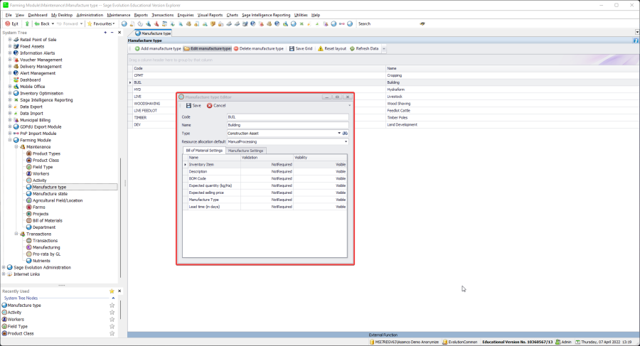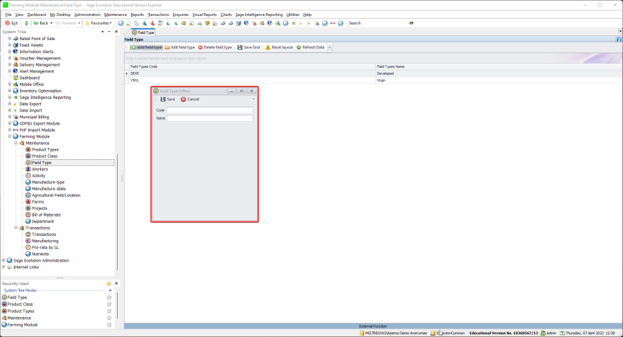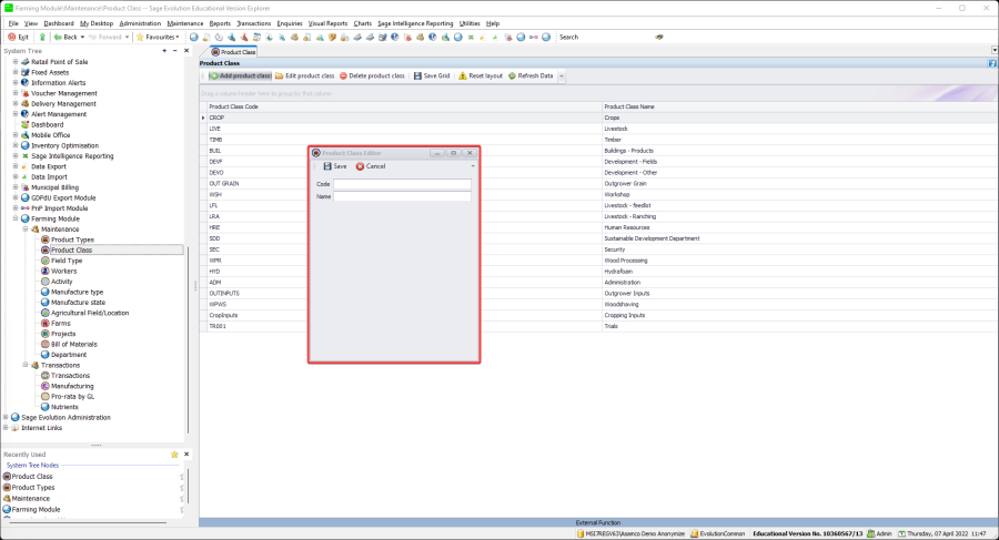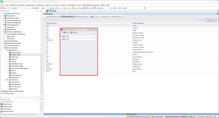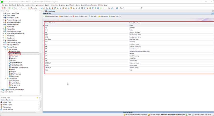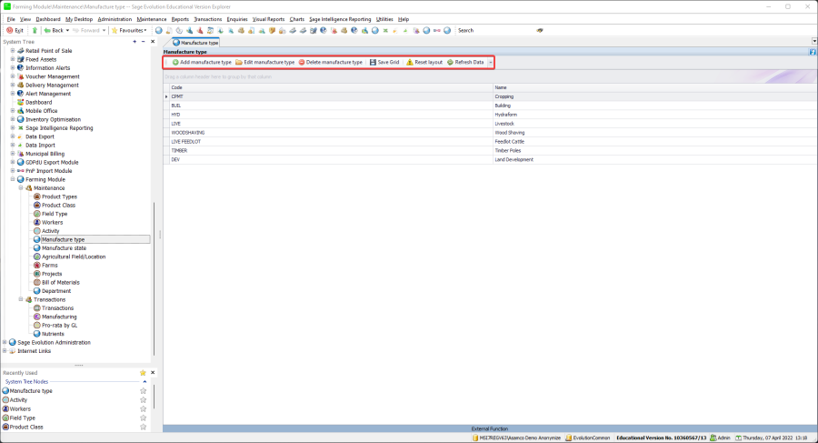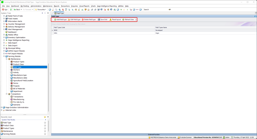 Under the maintenance tab you will find various nodes in which you can maintain your farming module, click on the product types node either using the left tree menu or the overview screen as shown below.