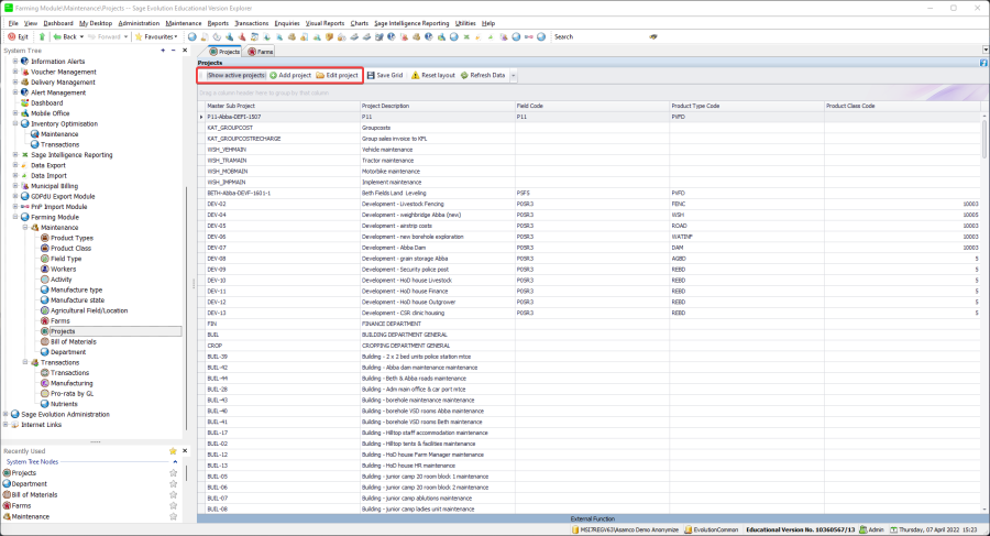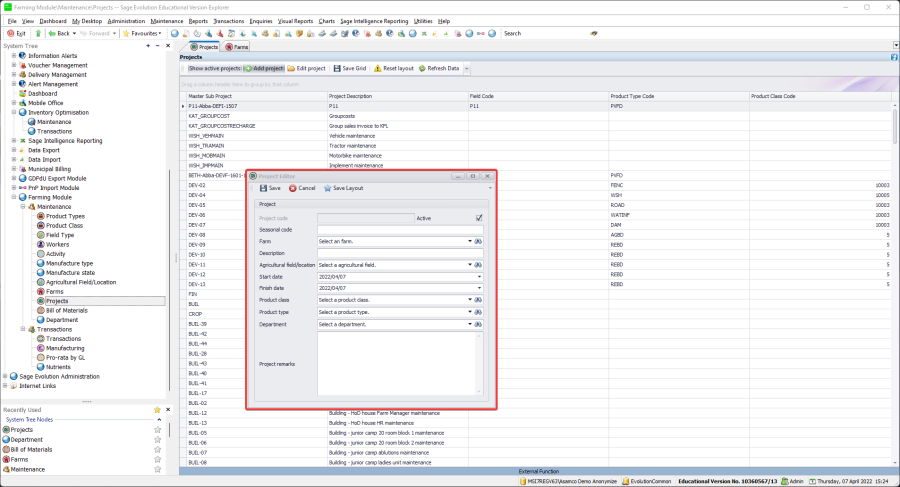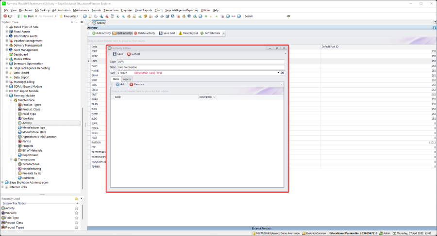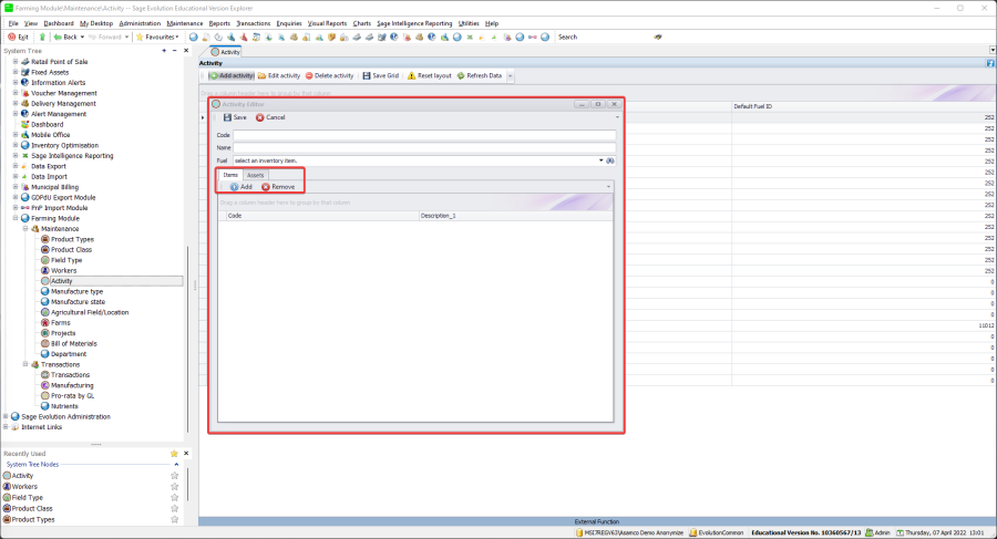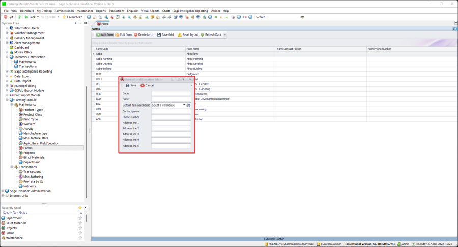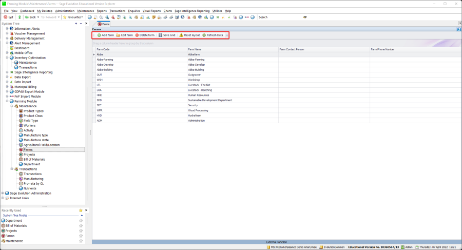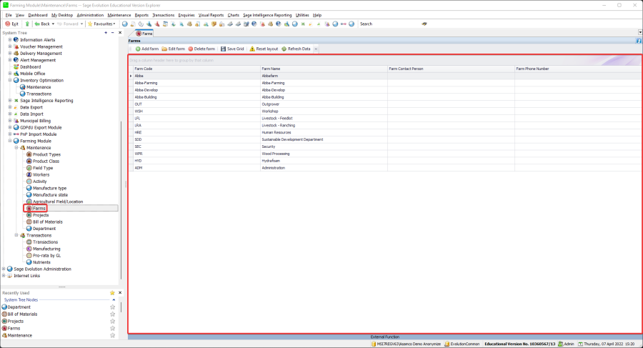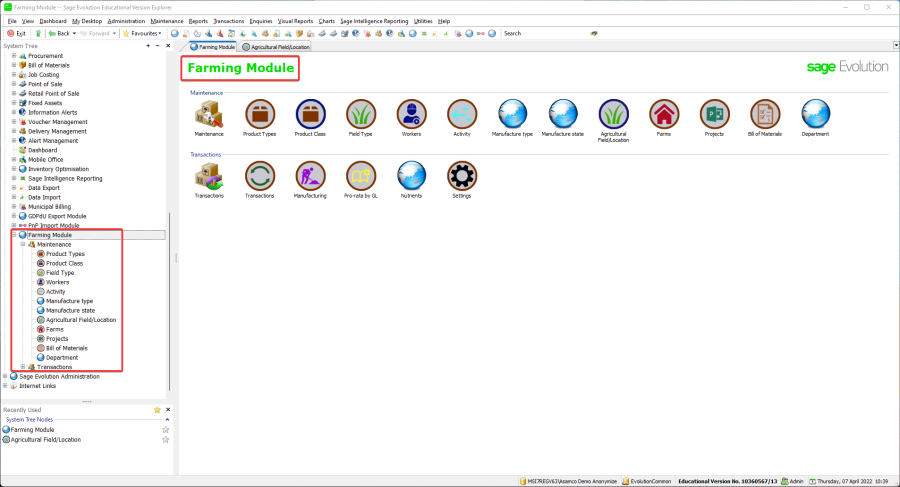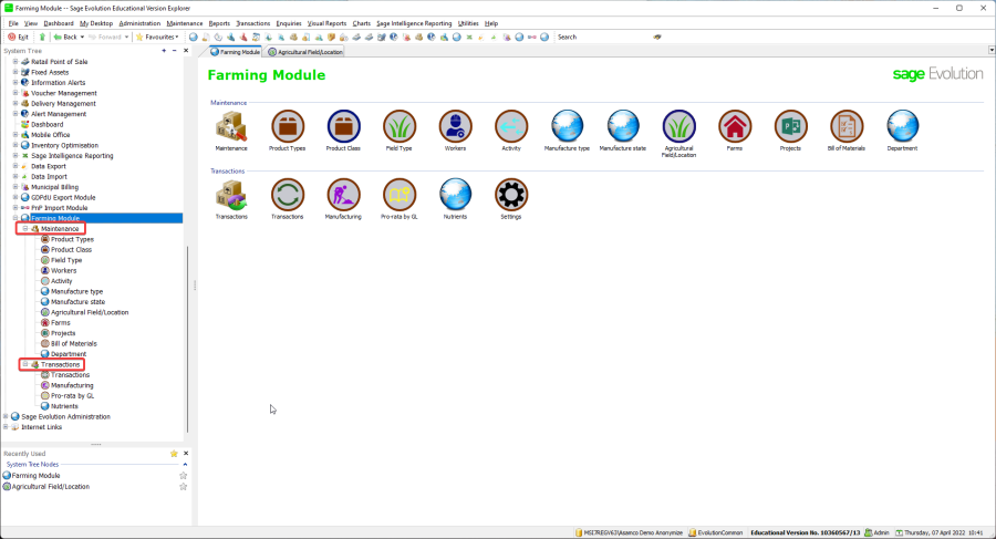 In the farming module you should find two tabs depending on your user permissions, these include the maintenance tab and the transactions tab, as shown below: