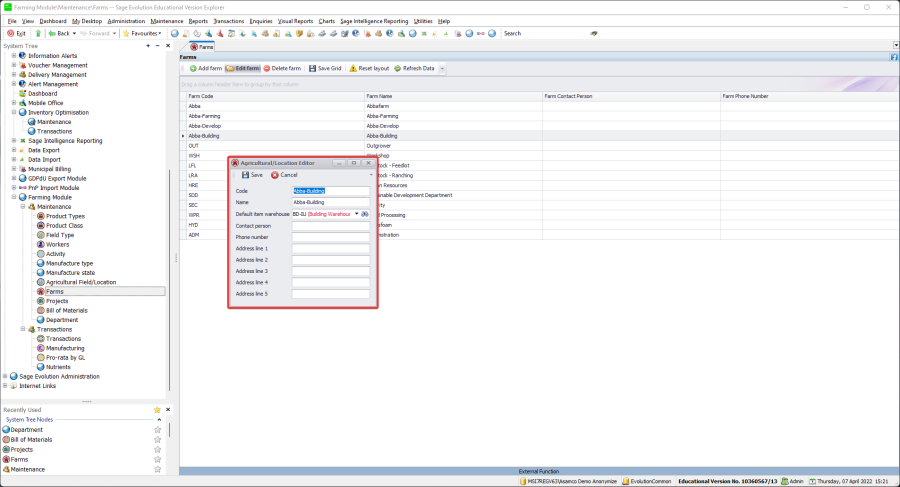 Editing the farm can be done by clicking the edit button as shown previously and you will see the same pop-up screen as shown above. Update the relevant info and then click the save button to save your changes or the cancel button to discard any changes made.