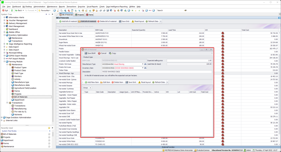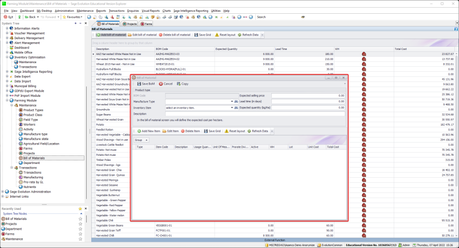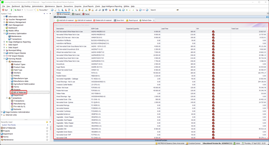 To view the bill of materials overview screen, click on the left tree menu and you will see the following screen displayed