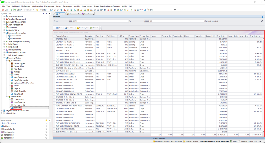 To view the nutrients overview screen, click on the left tree menu and you will see the following screen displayed.