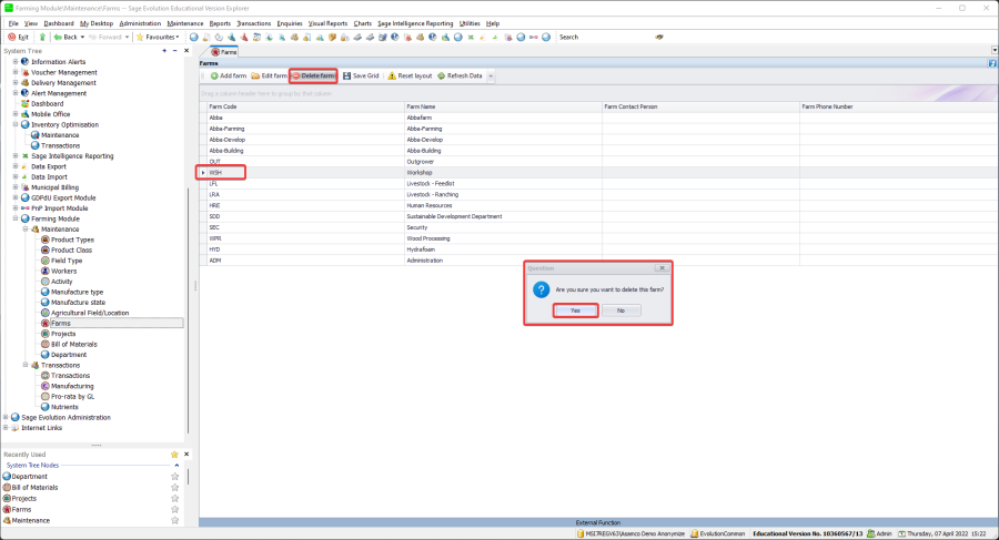 To delete a farm, firstly select the field type you would like to delete and then click the delete button and click on yes to confirm.