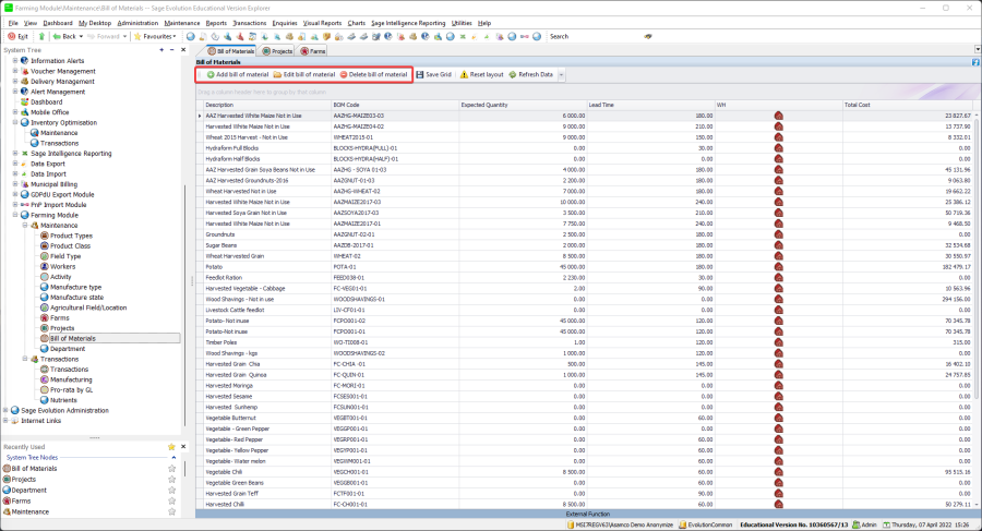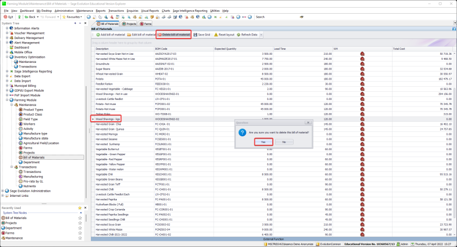 To delete a bill of materials, firstly select the field type you would like to delete and then click the delete button and click on yes to confirm.