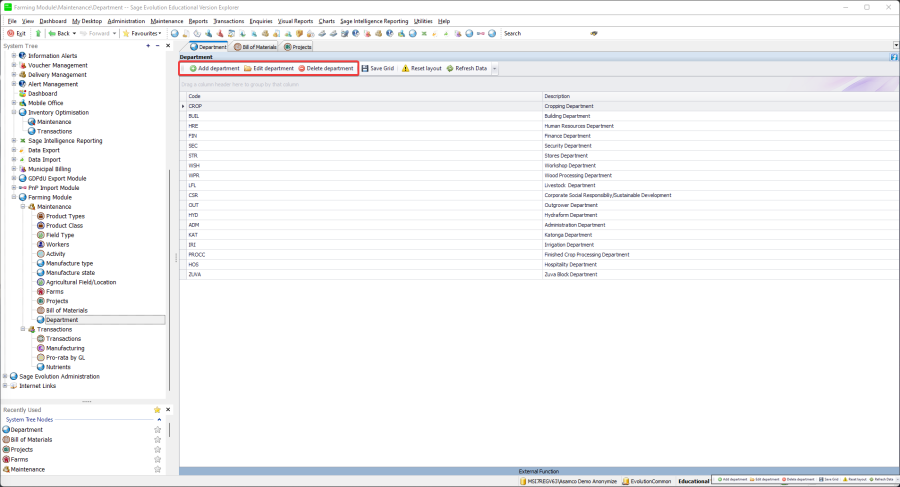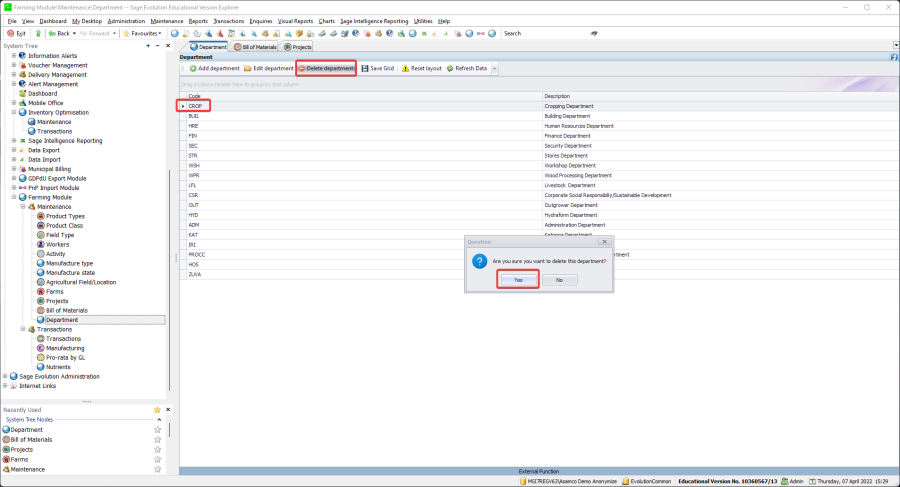 To delete a department, firstly select the field type you would like to delete and then click the delete button and click on yes to confirm.