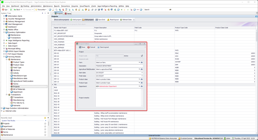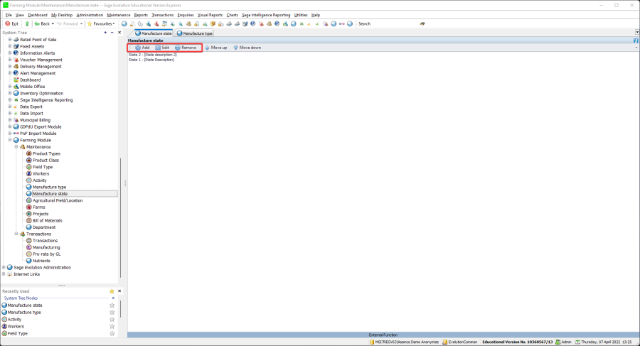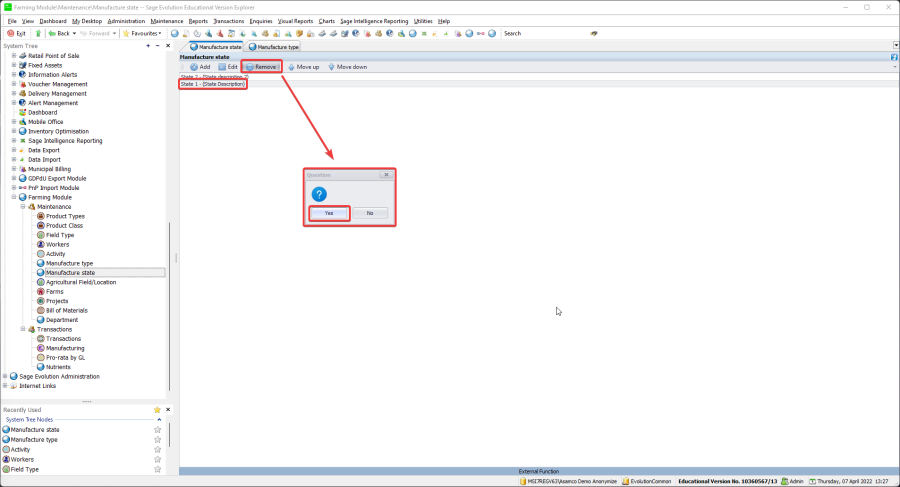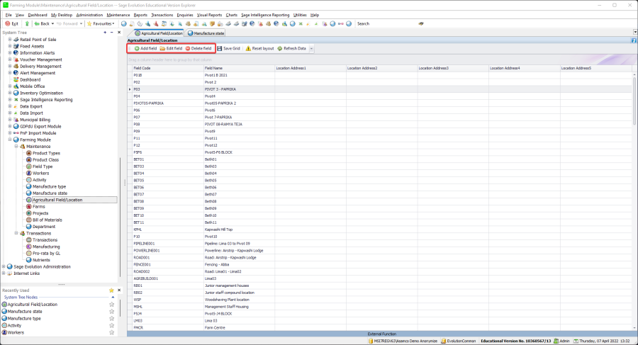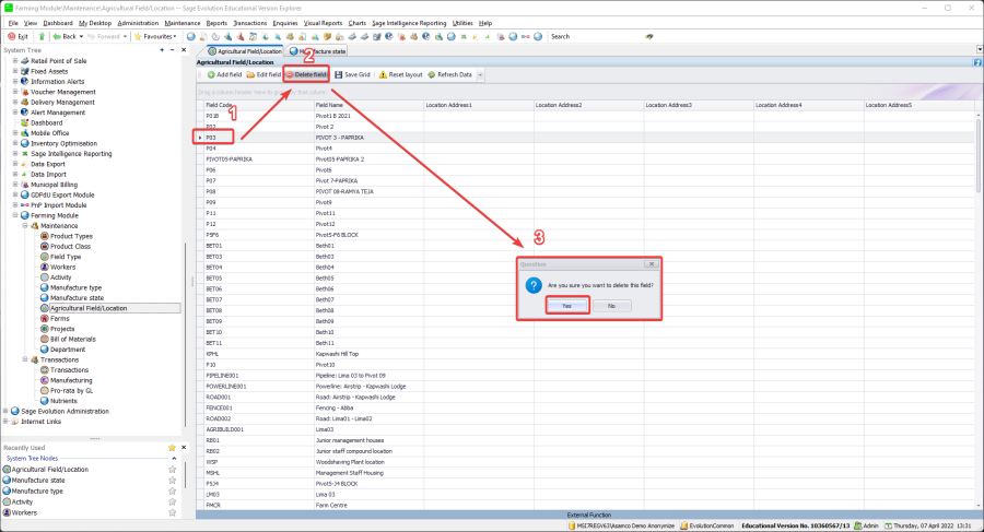 To delete an agriculture field/location, firstly select the manufacture type you would like to delete and then click the delete button and click on yes to confirm.