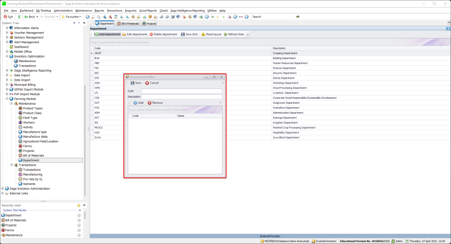 When adding a department you will see the following pop-up screen displayed in which you are required to fill out the department code and name. Once you have filled in all the relevant information click on the save button and your new department will be added to the overview screen.