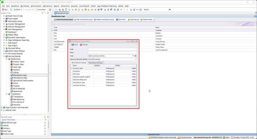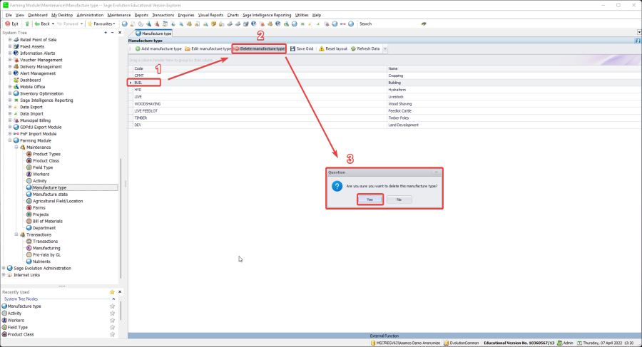 To delete a manufacture type, firstly select the manufacture type you would like to delete and then click the delete button and click on yes to confirm.