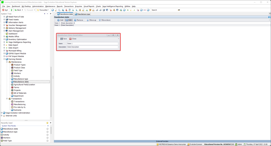 Editing the manufacture state can be done by clicking the edit button as shown previously and you will see the same pop-up screen as shown above. Update the relevant info and then click the save button to save your changes or the cancel button to discard any changes made.