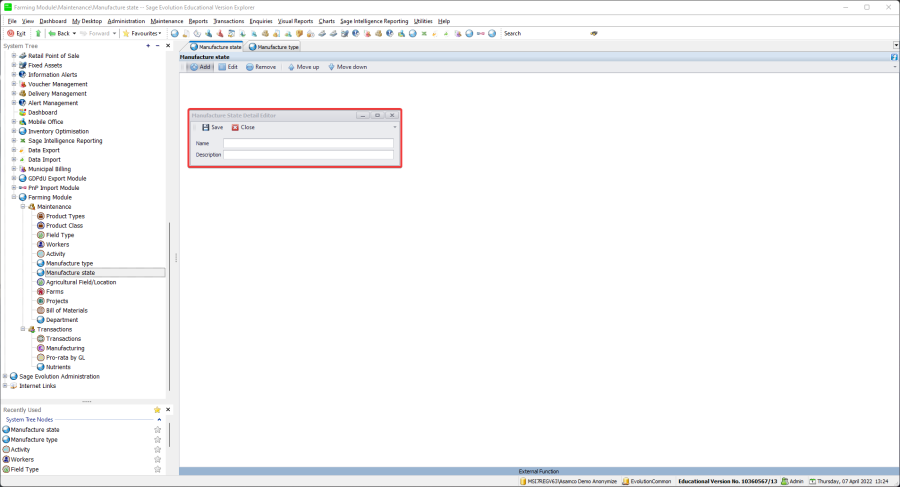 When adding a manufacture state you will see the following pop-up screen displayed in which you are required to fill out the field code and name. Once you have filled in all the relevant information click on the save button and your new manufacture state will be added to the overview screen.