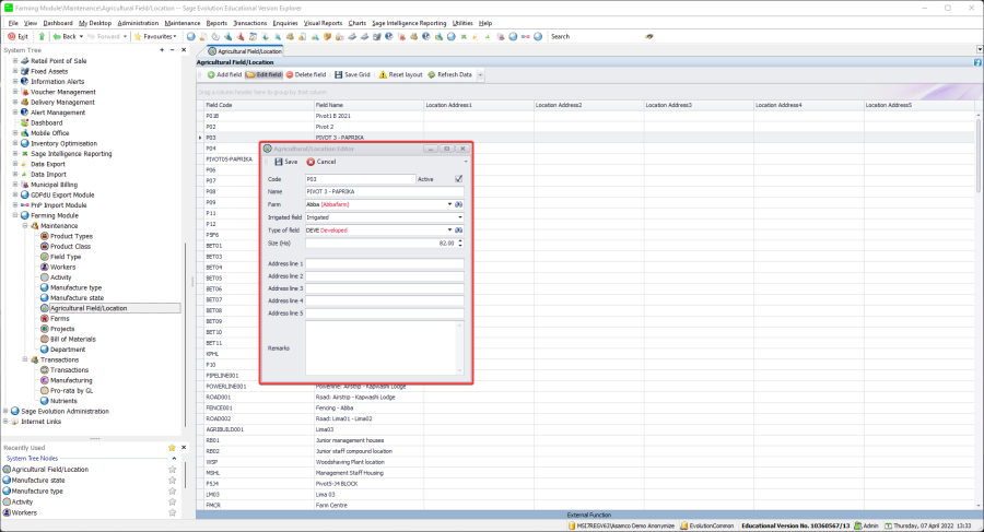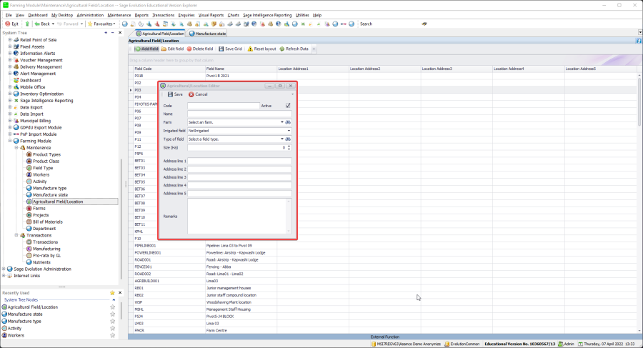 When adding an agriculture field/location you will see the following pop-up screen displayed in which you are required to fill out the agriculture field/location code and name. Once you have filled in all the relevant information click on the save button and your new agriculture field/location will be added to the overview screen.