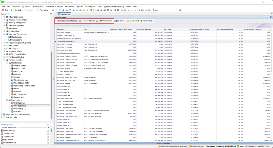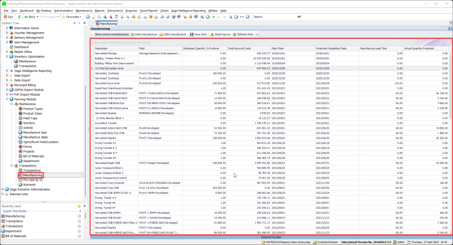 To view the manufacture overview screen, click on the left tree menu and you will see the following screen displayed