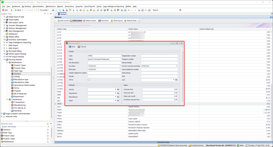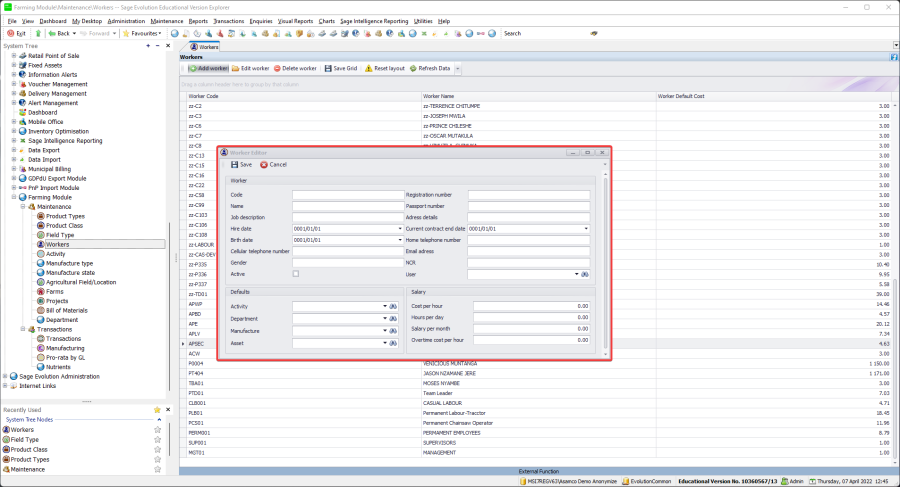 Editing a worker can be done by clicking the edit button as shown previously and you will see the same pop-up screen as shown above. Update the relevant info and then click the save button to save your changes or the cancel button to discard any changes made.