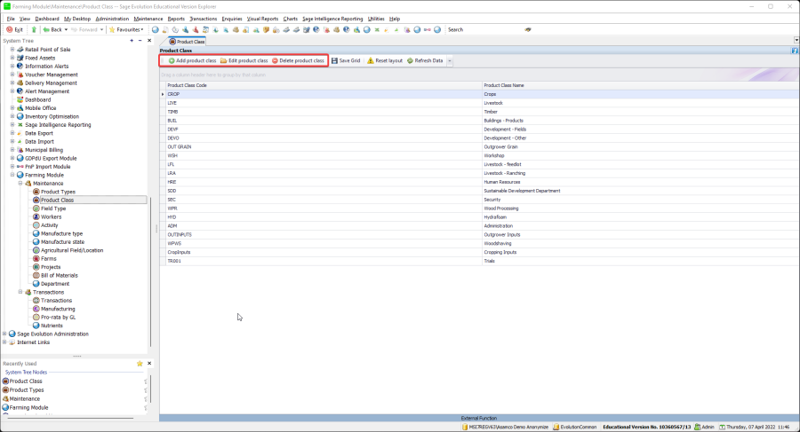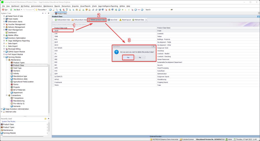 To delete a product class, firstly select the product type you would like to delete and then click the delete button and click on yes to confirm.