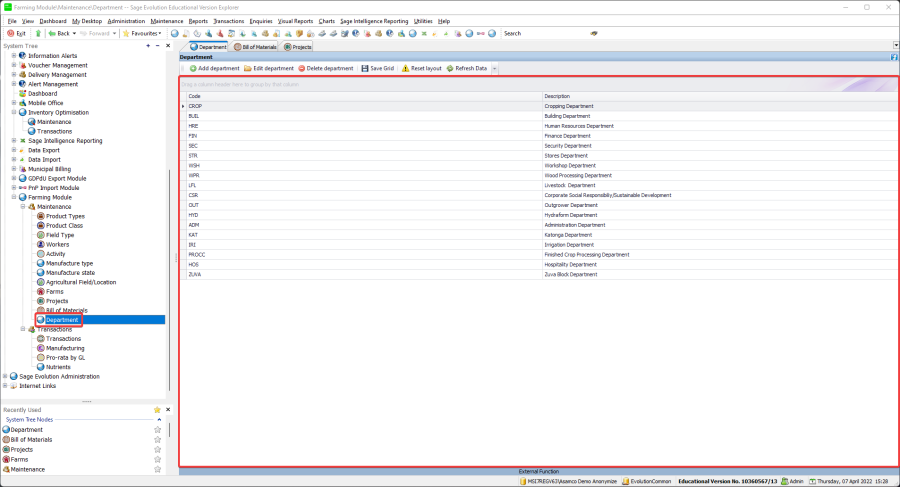 To view the department overview screen, click on the left tree menu and you will see the following screen displayed