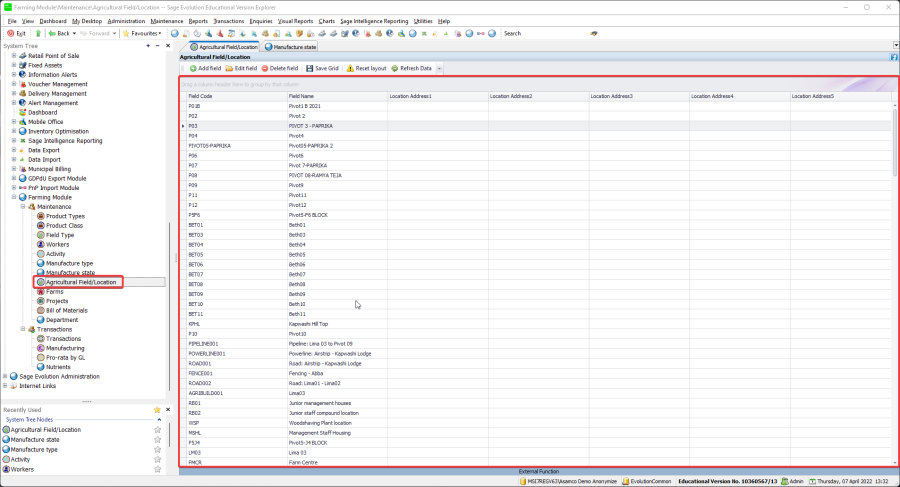To view the agriculture field/location overview screen, click on the left tree menu and you will see the following screen displayed
