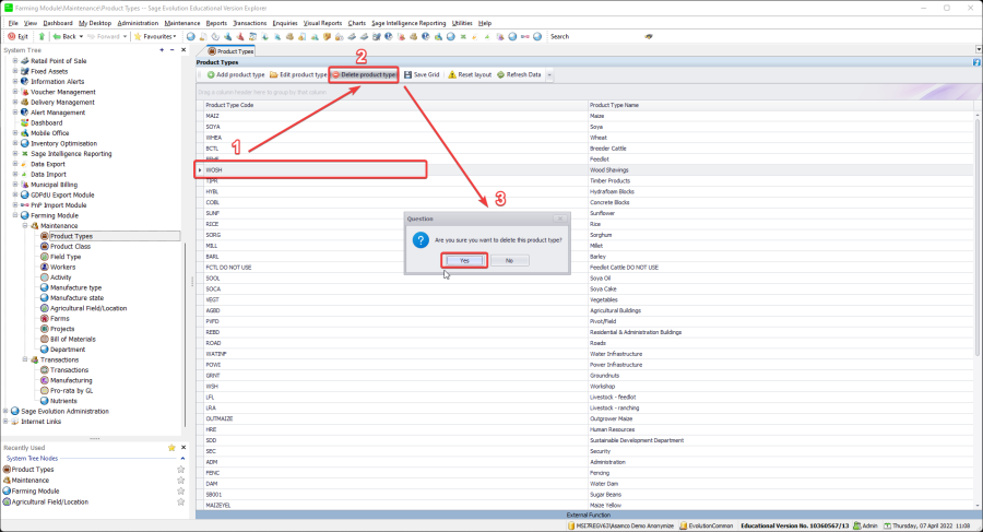To delete a product type, firstly select the product type you would like to delete and then click the delete button and click on yes to confirm.