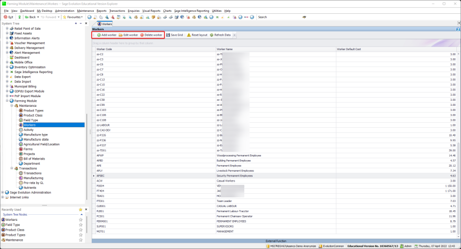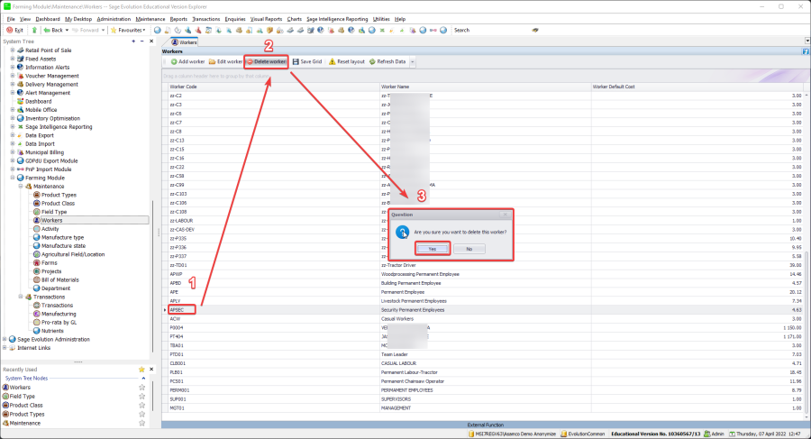 To delete a product class, firstly select the worker you would like to delete and then click the delete button and click on yes to confirm.