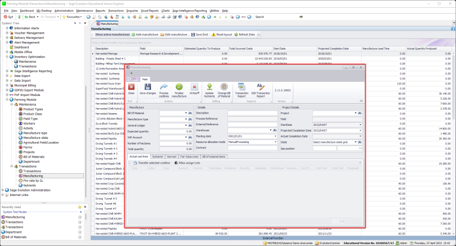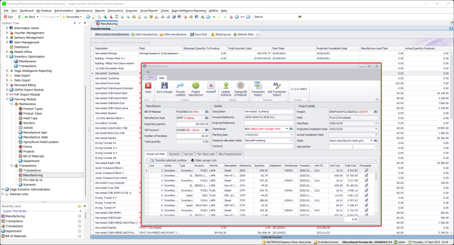By clicking on the finalize manufacture to validate your actual costs, next click on the process cost lines button to post and process your manufacture costs.