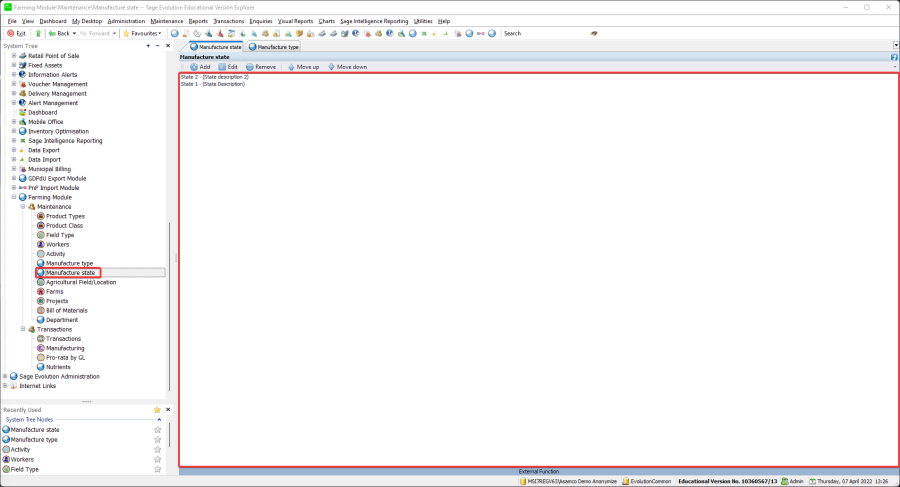 To view the manufacture state overview screen, click on the left tree menu and you will see the following screen displayed