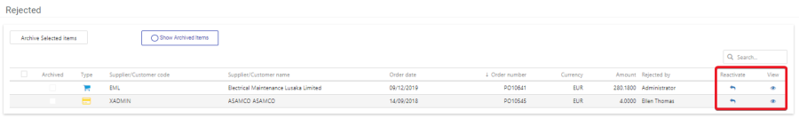 This overview screen ("Overviews" >> "Rejected") shows all rejected documents. Note that like the other overview pages, this screen (by default) will only show the documents which are either rejected by you or are rejected documents you have submitted (see the image below).