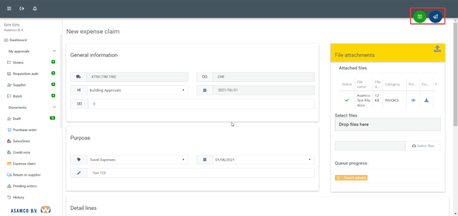 Once all the detail lines and all mandatory information have been added to the EC, you can submit the EC.