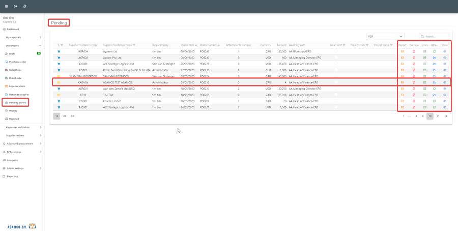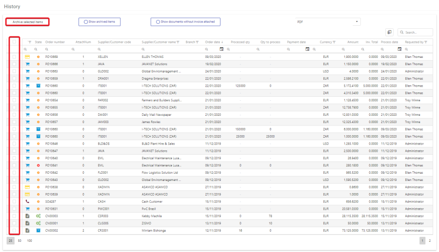 This overview screen ("Overviews" >> "History") shows all fully approved/processed documents. You can easily recognize the type of document based on the icon in the second column, by virtue of the type of filter you can easily filter the overview, by clicking the box in the first column of the overview and clicking on the "Archive selected items", you can archive the according item. By archiving the EC, you indicate that they are completely handled and that no further process remains.