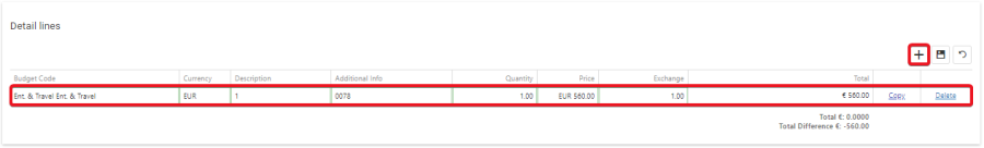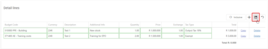 Once all the mandatory information has been added to your detail line(s) you can click on the "save" icon as shown below to add these line(s) to your EC.