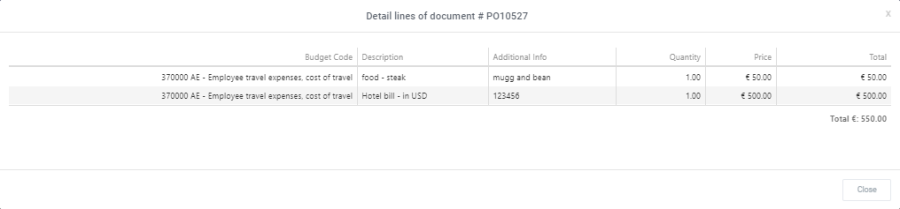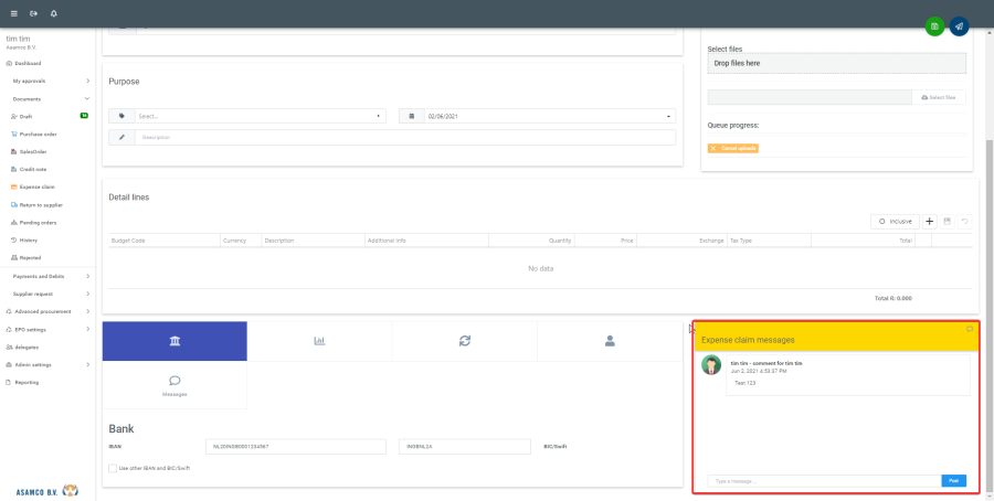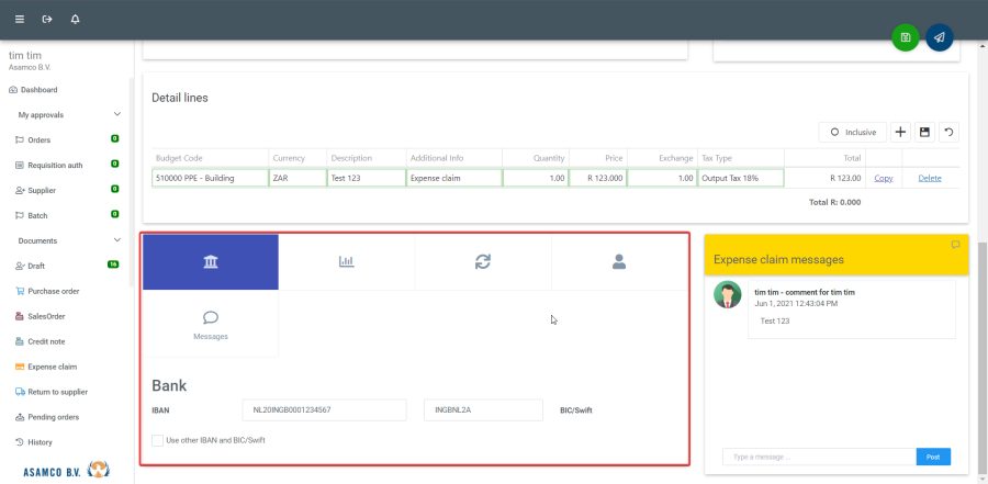 Below the detail lines you will see multiple tabs where you can view the bank details, budget vs actual figures (based on the company's configuration for the budget vs actuals comparison), the workflow steps, personal details, and a message tab where you can type out your "external messages".