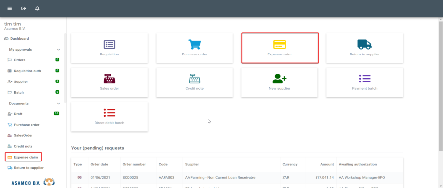 In case you feel like you are missing something, please address this request to your organisation administrator. In addition, the dashboard shows you the documents that you have submitted and that are still pending approval. You can create a new expense claim using the "expense claim" button on the dashboard or the "expense claim" node on the left tree menu.