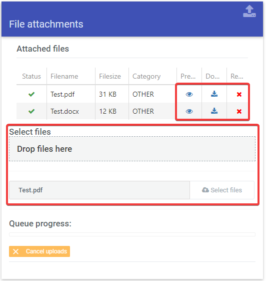 - Click on "select files" (see the image on the right) which will open the file explorer with your documents. From there you can select the document you want to upload to the EC. Again, the category needs to be selected before the file can be attached to the EC (see image below). Click save to finish the upload.