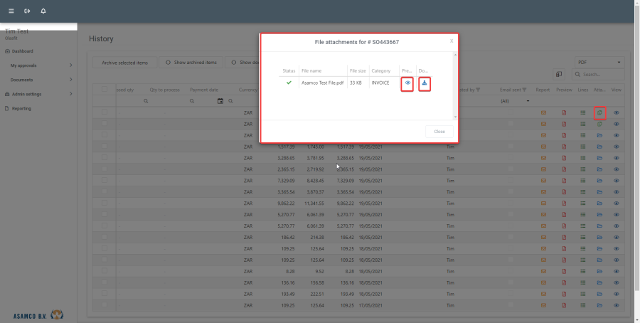 The document attachments can also be viewed and downloaded directly from within the history folder by clicking the green folder button to view the attachments or the download button to download the file.