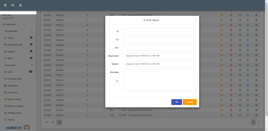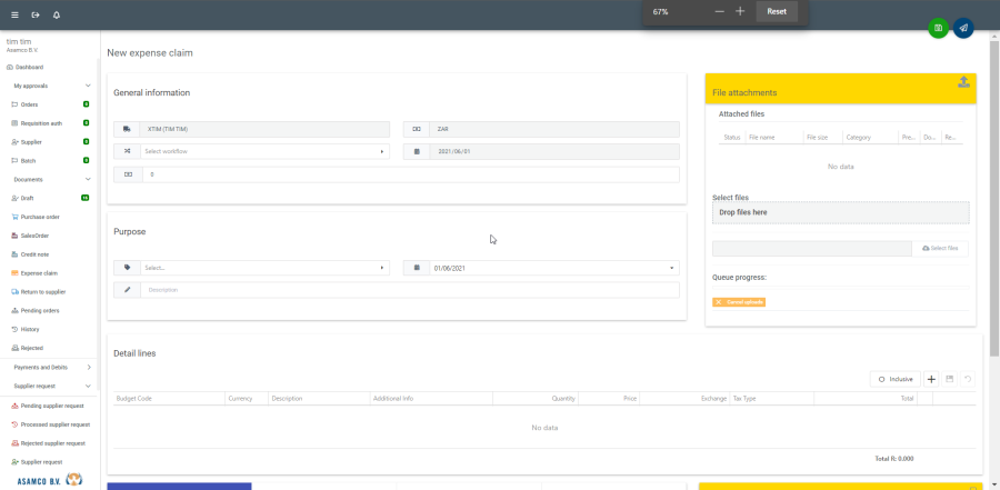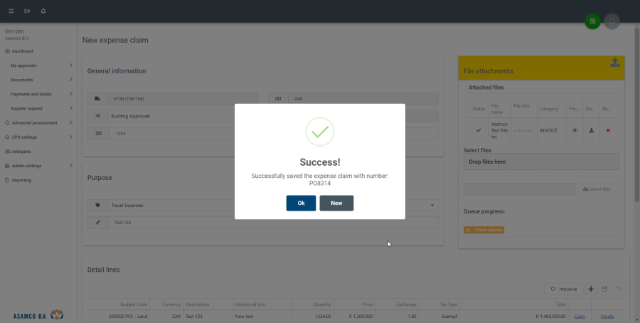 This is because the employees are setup as supplier and therefore the expense claim will be booked as a purchase order document. To avoid gaps in the numbering sequence, the expense claims submitted are assigned the next purchase order number as stored in your Sage Evolution database. Click "Ok" and the pending tab will be displayed or click on "New" to create a new EC.
