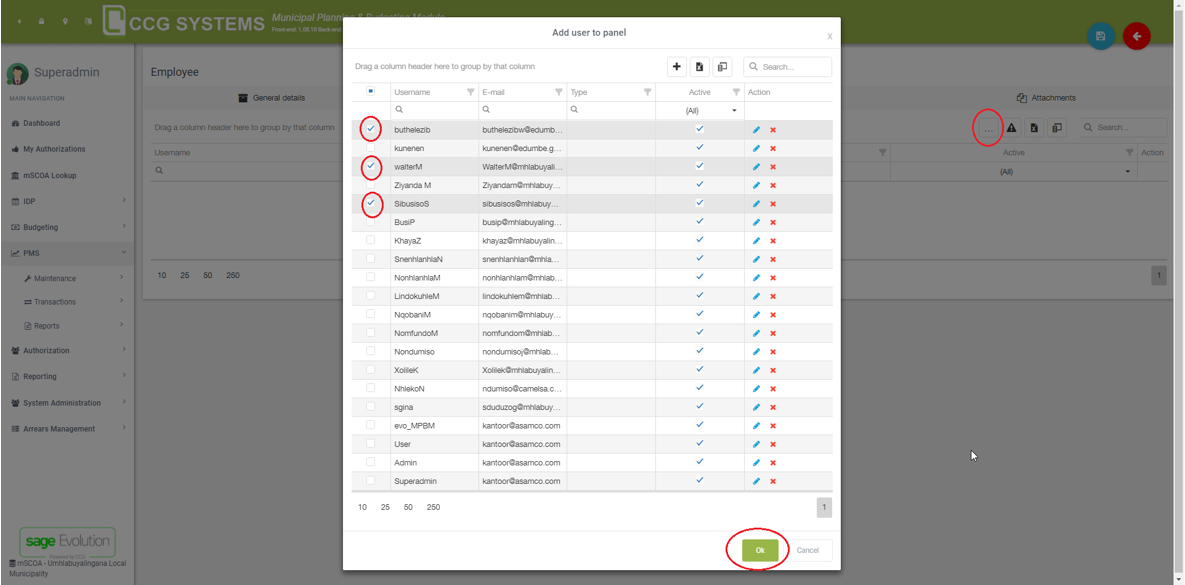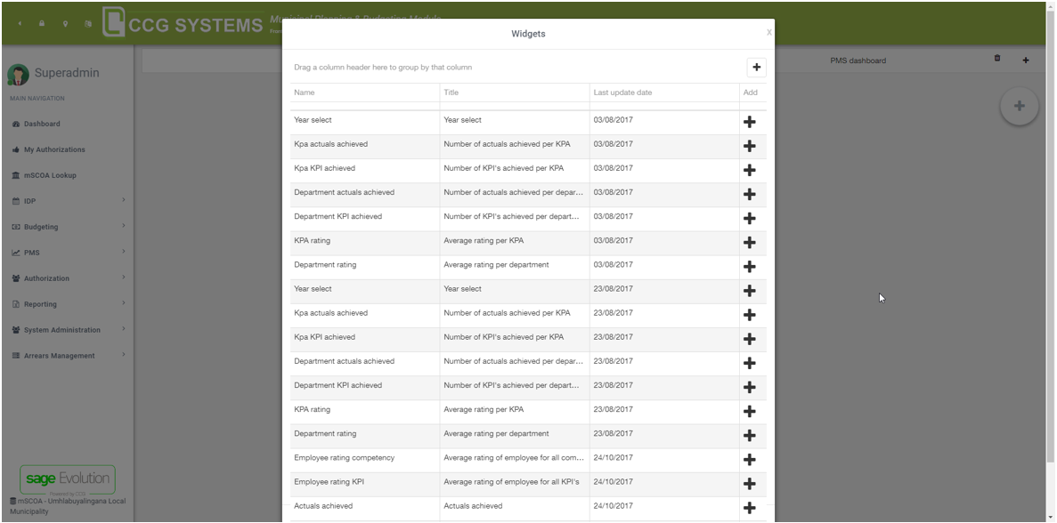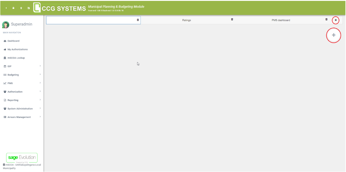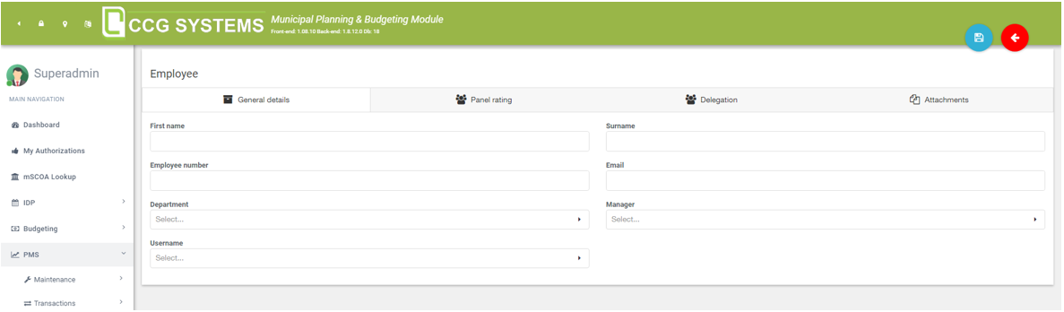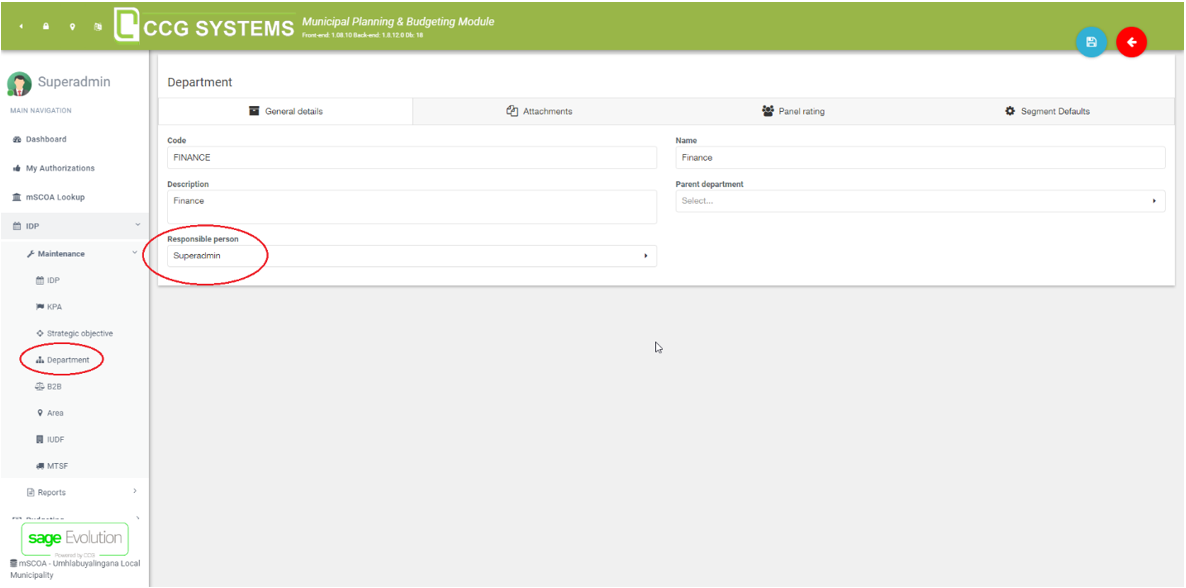 In the IDP section, you can specify the master data that is going to be used in the MPBM application. For example, which departments do you want to use? Departments are also important for the PMS module, because this is where you specify the responsible. In this case, the Superadmin is the responsible person for the finance department, see image below.
