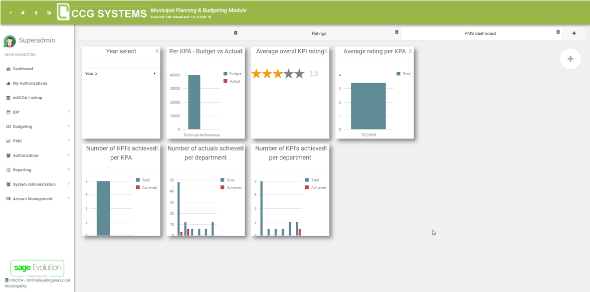 If you click on the newly created PMS tab, you will see an overview of reports selected for that tab. You can select a year in the first widget (called “Year select”), which will affect all the other widgets (as it will then calculate the data for the specified year). Your screen might look like the one in the image below.