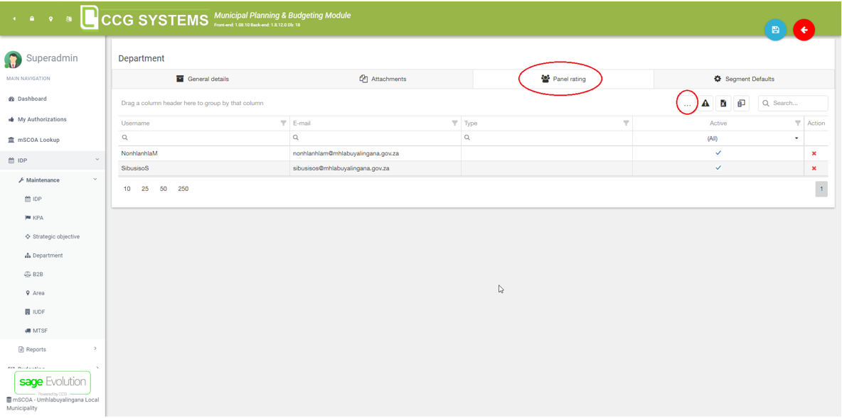 Besides a responsible person, you can also add a rating panel to a department. Add users to the panel by clicking on the “…” icon. The users in this panel will now be prompted to rate specific SDBIP’s for their department.