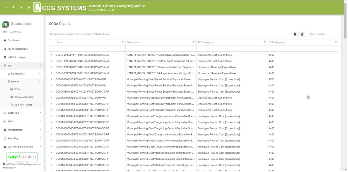 Besides the master data, the IDP section is used for reporting purposes. For example, navigating to IDP à Reports à mSCOA master detail, will give you an overview of all mSCOA accounts with the respective description and account type. See an example below.