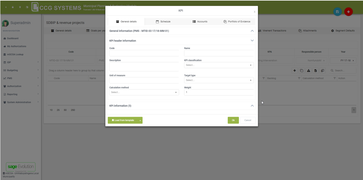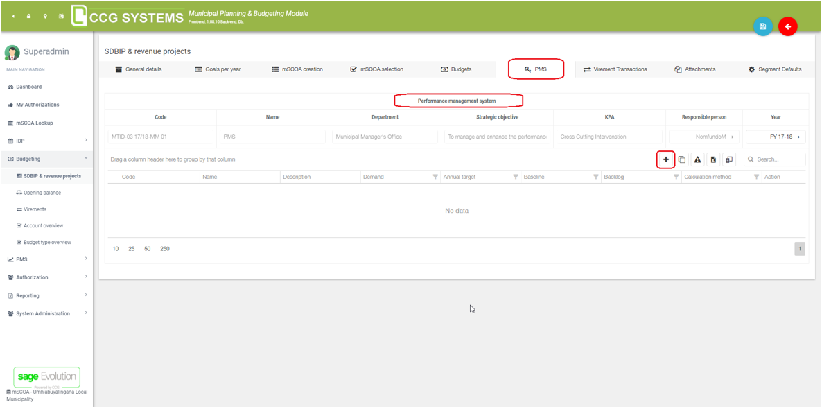 In the budgeting part of the MPBM app, you will find the SDBIP’s. SDBIP’s are where the KPI’s are tracked. When you open an SDBIP and go to the PMS tab, you will see a screen like in the image below. In the part that says “performance management system”, you can see general information like the code and name (in this case “PMS”), the department + responsible person, the strategic objective and KPA that the SDBIP is linked to and year for which it is tracked. Click on the “+” icon to add one or multiple KPI’s (or key performance indicators).