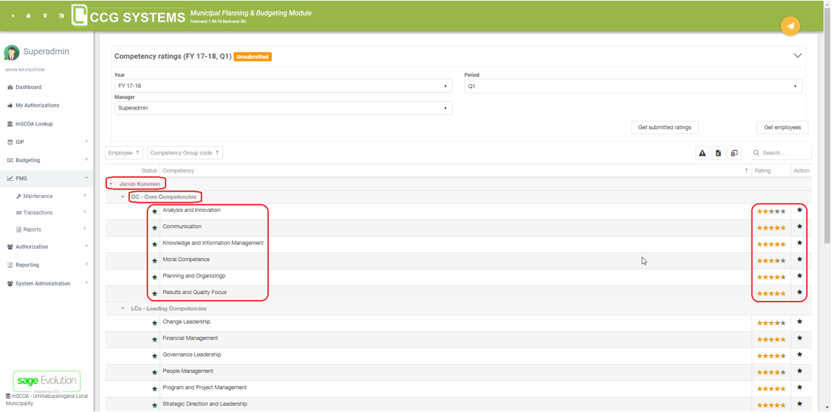 On the transactions part of the PMS module, we have two options: “PMS Actuals” and “Competency ratings”.