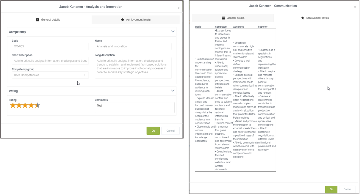 The second tab, with the achievement levels, gives you an idea of the levels of the competencies that can be achieved. This can help you to determine the rating for this particular person.